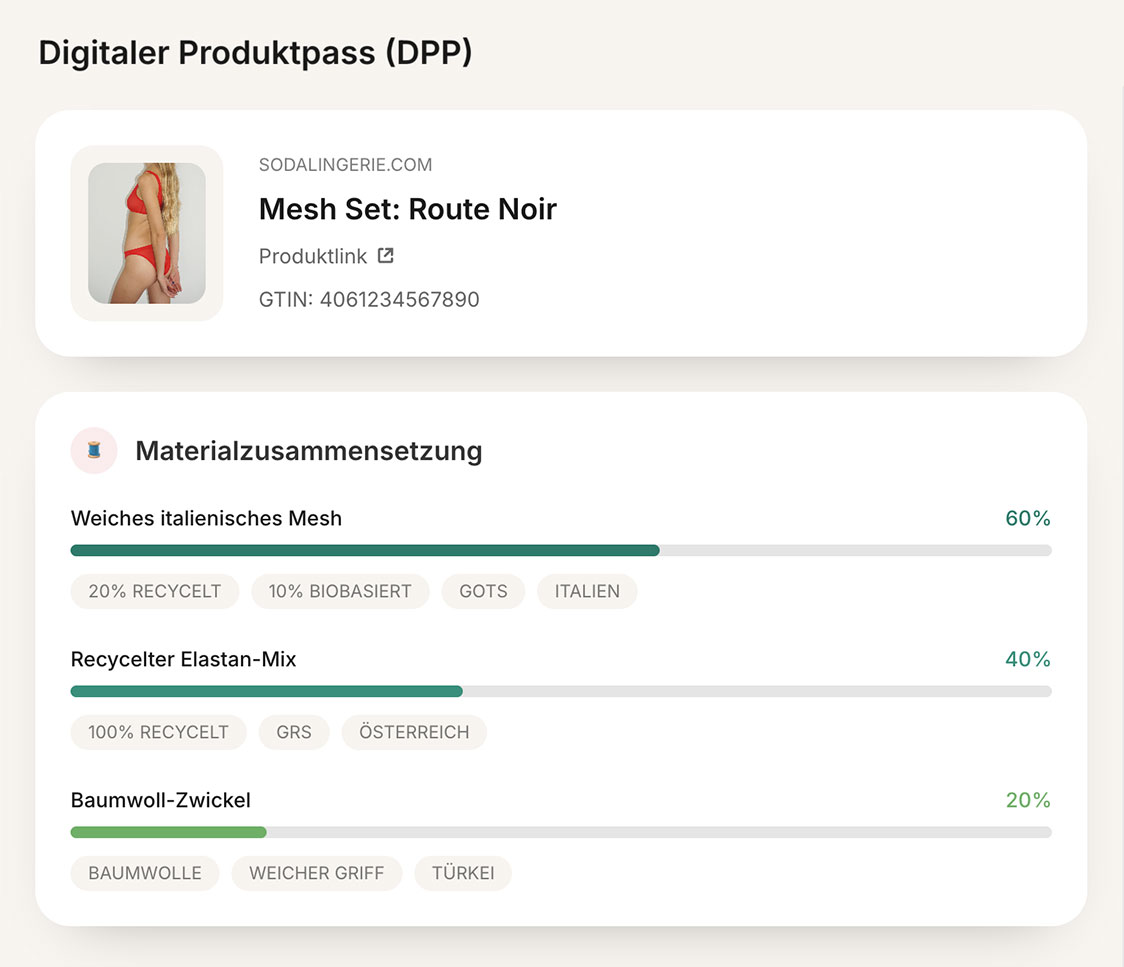 Der DPP Digital Product Pass gemäß ESPR Guidelines umfasst Informationen zu Materialien, Herkunft, Nachhaltigkeit, Reparaturfähigkeit und Konformität. Unsere Software stellt sicher, dass alle Anforderungen der EU Richtlinie Produktpass erfüllt werden.